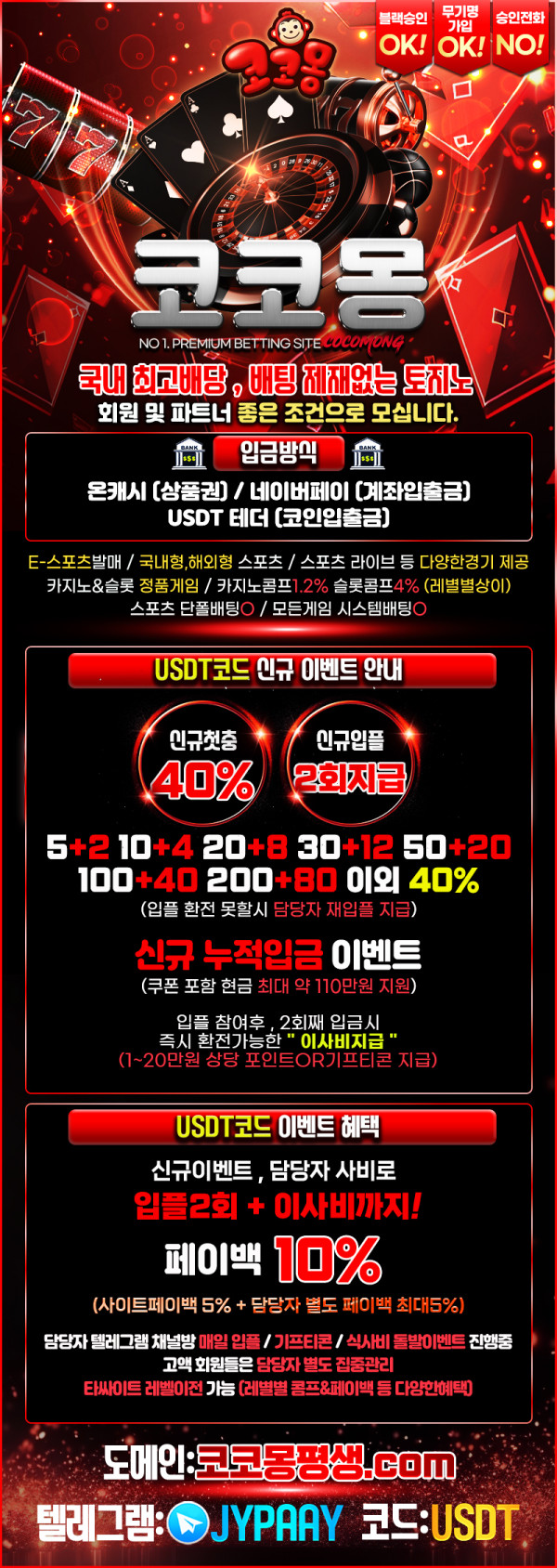 코코몽 첫충40% 입플2회 (스포츠입플 / 카지노입플 / 슬롯입플) , (온캐시 / USDT 테더 / 네이버페이 입출금) , (모든블랙 상관없이 가입승인 , 무기명가입O , 배팅제재 없는 고액전용 사이트)
