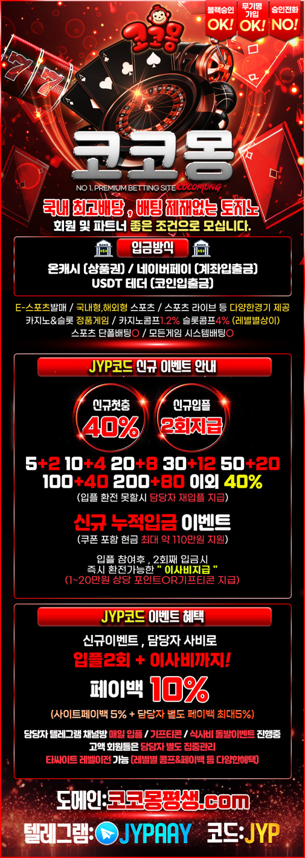 코코몽 JYP팀 (첫충40% , 입플2회 , 2회이상 충전시 이사비 1만원~30만원) E-스포츠발매 / 국내형,해외형스포츠 / 라이브등 다양한 경기제공 / 카지노 & 슬롯 정품알 사용