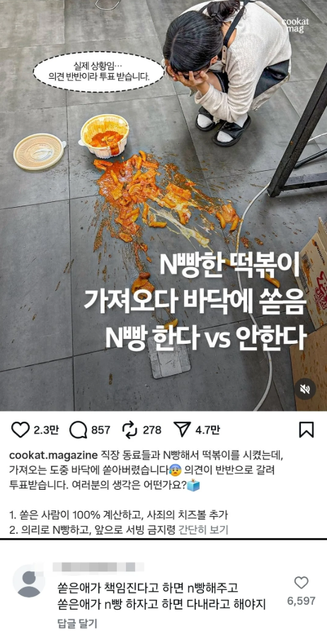 N빵한 떡볶이 가져오다 바닥에 쏟음 N빵 한다 vs 안한다
