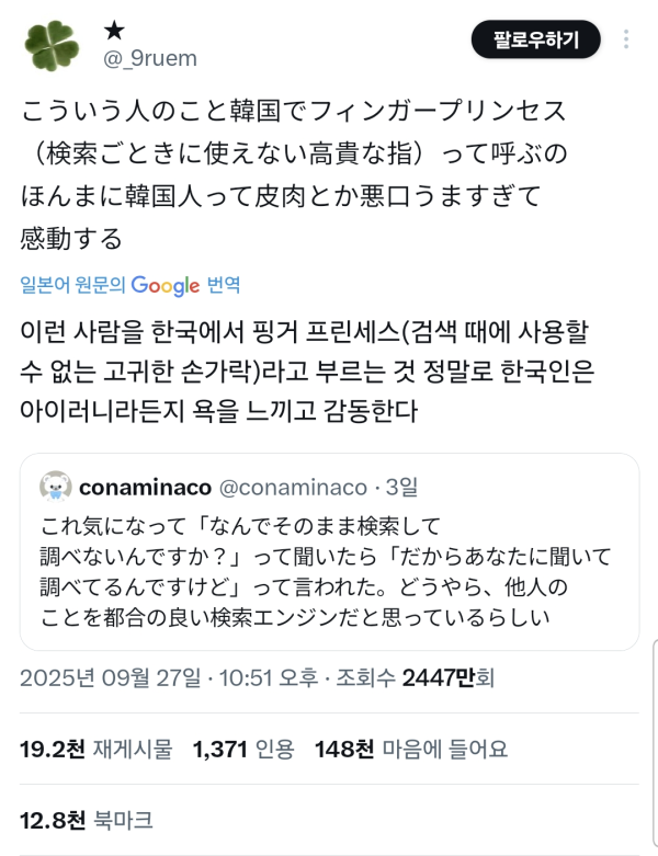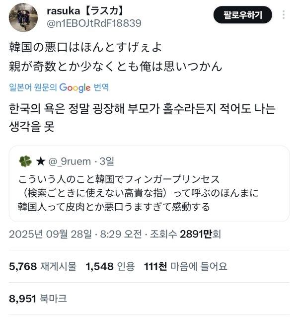 최신 일본으로 수출된 한국 욕설 작성자 정보 노잼러 작성 작성일 2025.10.01 11:08 컨텐츠 정보 11,312 조회 1 댓글 목록 본문 최신 일본으로 수출된 한국 욕설 관련자료 서명 i'm 노잼러 댓글 1 구로디지털님의 댓글 구로디지털 작성일 2025.10.01 17:15 최근에 가장 인상깊었던 욕은 "에미가 태교를 틱톡으로 했느냐"였음 최근에 가장 인상깊었던 욕은 "에미가 태교를 틱톡으로 했느냐"였음 로그인한 회원만 댓글 등록이 가능합니다. 목록