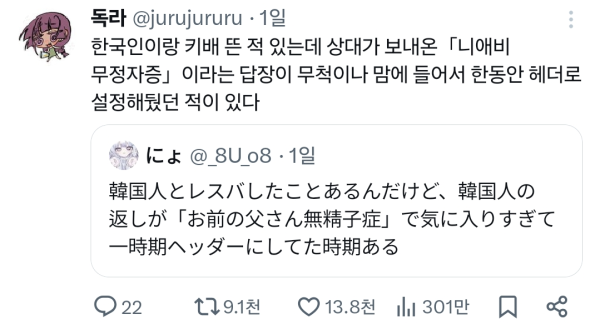 구로디지털님의 댓글 구로디지털 작성일 2025.10.01 17:15 최근에 가장 인상깊었던 욕은 "에미가 태교를 틱톡으로 했느냐"였음 최근에 가장 인상깊었던 욕은 "에미가 태교를 틱톡으로 했느냐"였음