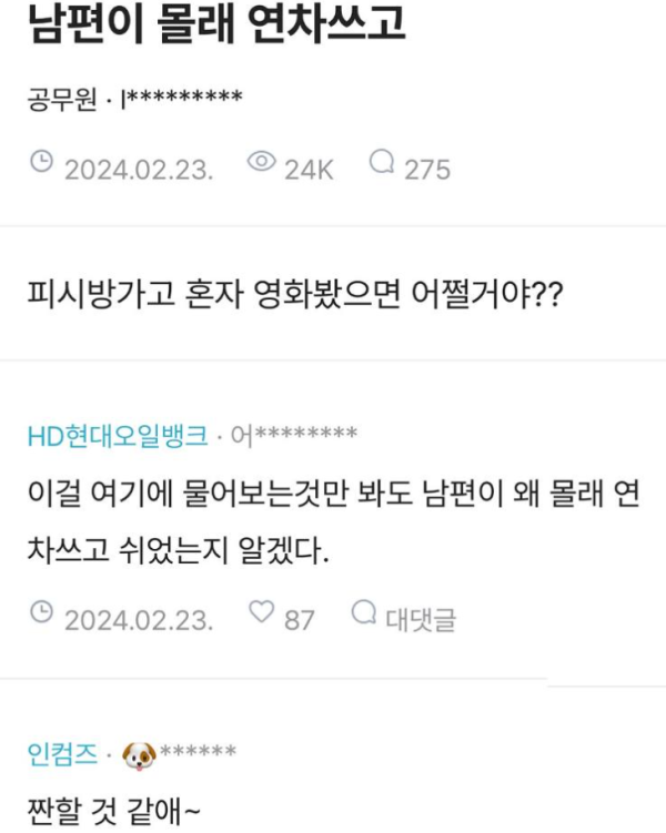 남편이 몰래 연차쓰고 작성자 정보 노잼러 작성 작성일 2025.10.06 11:17 컨텐츠 정보 10,185 조회 1 댓글 목록 본문 남편이 몰래 연차쓰고 관련자료 서명 i'm 노잼러 댓글 1 장클로드님의 댓글 장클로드 작성일 10.06 13:21 그냥 간거지 그냥 간거지 로그인한 회원만 댓글 등록이 가능합니다. 목록