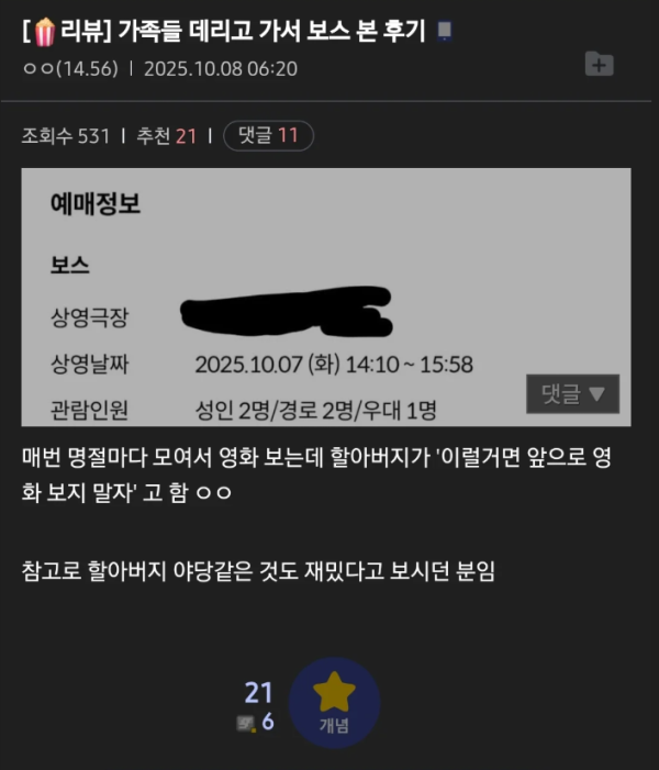 추석때 할아버지랑 영화본 후기 작성자 정보 노잼러 작성 작성일 2025.10.08 11:39 컨텐츠 정보 9,468 조회 1 댓글 목록 본문 톱맨봤으면 할아버지도 레제를 보고 울부짖었을것 관련자료 서명 i'm 노잼러 댓글 1 팁스터김만춘님의 댓글 팁스터김만춘 작성일 10.08 14:43 ??? ??? 로그인한 회원만 댓글 등록이 가능합니다. 목록