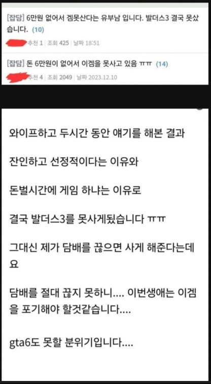 6만원이 없어서 게임을 못 사는 유부남 작성자 정보 노잼러 작성 작성일 2025.10.08 11:49 컨텐츠 정보 9,261 조회 1 댓글 목록 본문 6만원이 없어서 게임을 못 사는 유부남 관련자료 서명 i'm 노잼러 댓글 1 댕댕이불알님의 댓글 댕댕이불알 작성일 10.08 14:45 돈을 벌어도 쓰질못하누 돈을 벌어도 쓰질못하누 로그인한 회원만 댓글 등록이 가능합니다. 목록