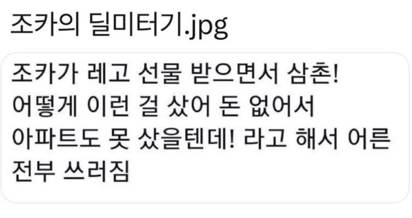 이번추석에 팩폭 당하버린 삼촌 ㄷㄷ 작성자 정보 노잼러 작성 작성일 2025.10.09 11:22 컨텐츠 정보 8,654 조회 목록 본문 이번추석에 팩폭 당하버린 삼촌 ㄷㄷ 관련자료 서명 i'm 노잼러 댓글 0 등록된 댓글이 없습니다. 로그인한 회원만 댓글 등록이 가능합니다. 목록