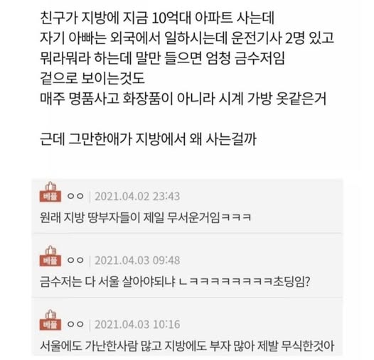 지방 아파트에 사는 금수저도 있음? 작성자 정보 노잼러 작성 작성일 2025.10.13 11:23 컨텐츠 정보 99 조회 목록 본문 지방 아파트에 사는 금수저도 있음? 관련자료 서명 i'm 노잼러 댓글 0 등록된 댓글이 없습니다. 로그인한 회원만 댓글 등록이 가능합니다. 목록