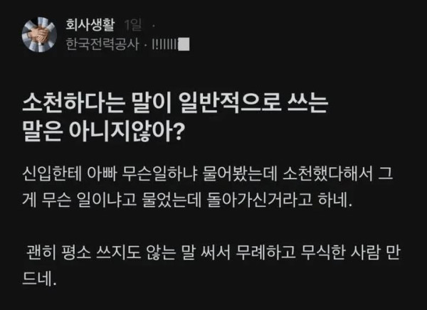 신입이 어려운 말 써서 자기가 무식한 사람 됐다는 한전 직원 작성자 정보 노잼러 작성 작성일 2025.10.22 11:18 컨텐츠 정보 168 조회 목록 본문 신입이 어려운 말 써서 자기가 무식한 사람 됐다는 한전 직원 관련자료 서명 i'm 노잼러 댓글 0 등록된 댓글이 없습니다. 로그인한 회원만 댓글 등록이 가능합니다. 목록