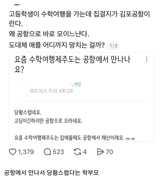 현재 논란인 수학여행 논란 작성자 정보 노잼러 작성 작성일 2025.10.23 10:57 컨텐츠 정보 422 조회 목록 본문 현재 논란인 수학여행 논란 관련자료 서명 i'm 노잼러 댓글 0 등록된 댓글이 없습니다. 로그인한 회원만 댓글 등록이 가능합니다. 목록