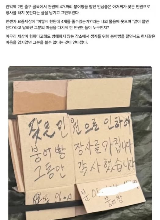 잦은 민원으로 붕어빵 장사를 그만두신 아저씨 작성자 정보 노잼러 작성 작성일 2025.10.25 10:44 컨텐츠 정보 10,078 조회 목록 본문 잦은 민원으로 붕어빵 장사를 그만두신 아저씨 관련자료 서명 i'm 노잼러 댓글 0 등록된 댓글이 없습니다. 로그인한 회원만 댓글 등록이 가능합니다. 목록