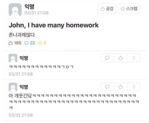 존나 과제 많다 작성자 정보 노잼러 작성 작성일 2025.10.26 11:09 컨텐츠 정보 5,295 조회 목록 본문 John I have many homework 관련자료 서명 i'm 노잼러 댓글 0 등록된 댓글이 없습니다. 로그인한 회원만 댓글 등록이 가능합니다. 목록