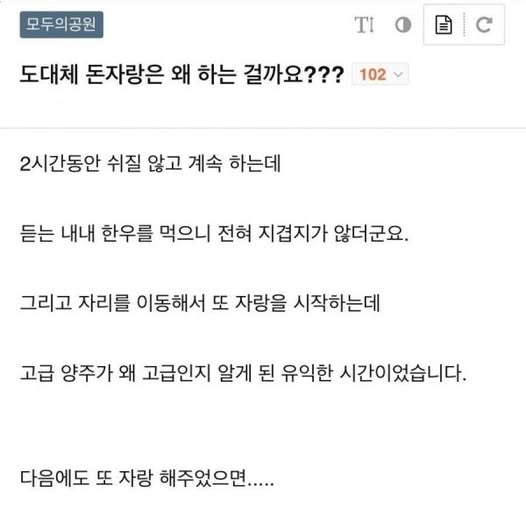 도대체 돈자랑은 왜 하는 걸까요? 작성자 정보 노잼러 작성 작성일 2025.10.27 10:50 컨텐츠 정보 254 조회 목록 본문 도대체 돈자랑은 왜 하는 걸까요? 관련자료 서명 i'm 노잼러 댓글 0 등록된 댓글이 없습니다. 로그인한 회원만 댓글 등록이 가능합니다. 목록