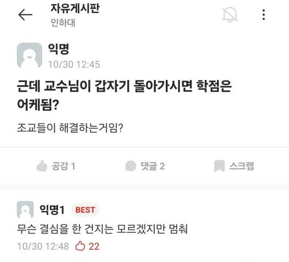 교수님이 갑자기 돌아가시면 학점은 어케됨? 작성자 정보 노잼러 작성 작성일 2025.11.01 11:06 컨텐츠 정보 206 조회 목록 본문 교수님이 갑자기 돌아가시면 학점은 어케됨? 관련자료 서명 i'm 노잼러 댓글 0 등록된 댓글이 없습니다. 로그인한 회원만 댓글 등록이 가능합니다. 목록