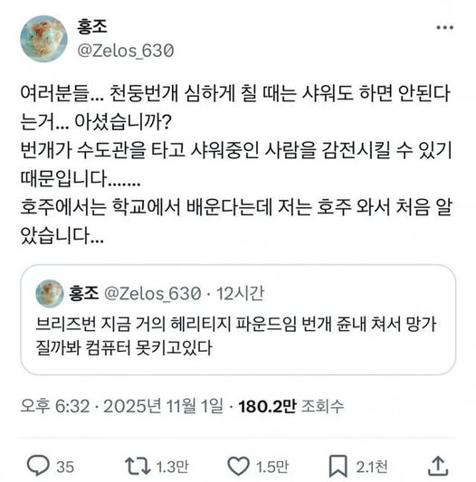 천둥번개 칠때 의외로 절대 하면 안되는 것 작성자 정보 노잼러 작성 작성일 2025.11.03 11:28 컨텐츠 정보 652 조회 목록 본문 천둥번개 칠때 의외로 절대 하면 안되는 것 관련자료 서명 i'm 노잼러 댓글 0 등록된 댓글이 없습니다. 로그인한 회원만 댓글 등록이 가능합니다. 목록