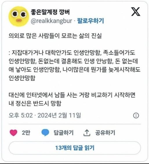 의외로 많은 사람들이 모르는 삶의 진실 작성자 정보 노잼러 작성 작성일 2025.11.03 11:31 컨텐츠 정보 663 조회 목록 본문 의외로 많은 사람들이 모르는 삶의 진실 관련자료 서명 i'm 노잼러 댓글 0 등록된 댓글이 없습니다. 로그인한 회원만 댓글 등록이 가능합니다. 목록