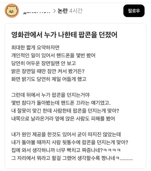 영화관에서 누가 팝콘 던짐 작성자 정보 노잼러 작성 작성일 2025.11.03 11:32 컨텐츠 정보 717 조회 목록 본문 영화관에서 누가 팝콘 던짐 관련자료 서명 i'm 노잼러 댓글 0 등록된 댓글이 없습니다. 로그인한 회원만 댓글 등록이 가능합니다. 목록