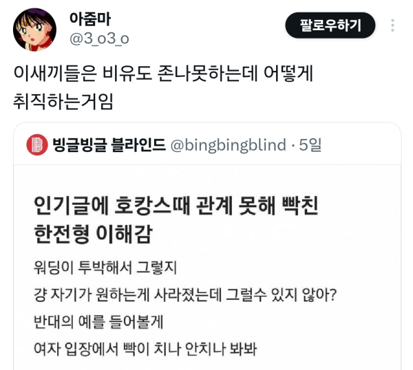 여자친구가 생리중인데 호캉스 가자해서 싸움 작성자 정보 동동구리무 작성 작성일 2025.11.04 14:34 컨텐츠 정보 553 조회 목록 본문 여자친구가 생리중인데 호캉스 가자해서 싸움 관련자료 댓글 0 등록된 댓글이 없습니다. 로그인한 회원만 댓글 등록이 가능합니다. 목록