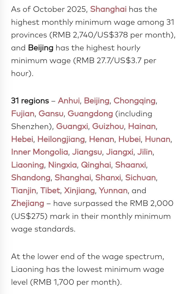 중국 최저임금 근황 작성자 정보 설사약 작성 작성일 2025.11.04 18:22 컨텐츠 정보 452 조회 목록 본문 상하이 : 월급 54만원 베이징: 월급 50만원 그외 31개 성 : 월급 40만원 랴오닝: 월급 34만원 2025년 10월 기준. 이게 많이 오른거라 함. 관련자료 댓글 0 등록된 댓글이 없습니다. 로그인한 회원만 댓글 등록이 가능합니다. 목록