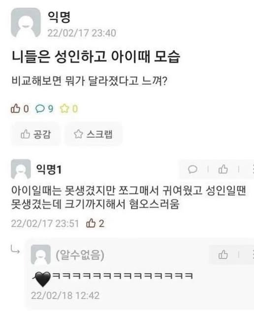 성인하고 애기 때 모습 비교하면 뭐가 달라졌다고 느껴져? 작성자 정보 노잼러 작성 작성일 2025.11.05 13:57 컨텐츠 정보 325 조회 목록 본문 성인하고 애기 때 모습 비교하면 뭐가 달라졌다고 느껴져? 관련자료 서명 i'm 노잼러 댓글 0 등록된 댓글이 없습니다. 로그인한 회원만 댓글 등록이 가능합니다. 목록