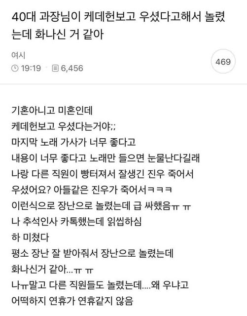 40대 과장님 조롱한 언ㄴㅣ 작성자 정보 노잼러 작성 작성일 2025.11.06 10:57 컨텐츠 정보 301 조회 목록 본문 40대 과장님 조롱한 언ㄴㅣ 관련자료 서명 i'm 노잼러 댓글 0 등록된 댓글이 없습니다. 로그인한 회원만 댓글 등록이 가능합니다. 목록