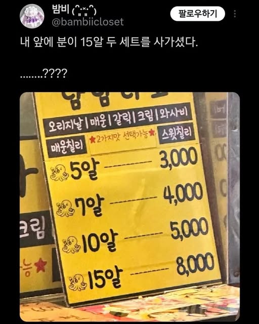산수를 못 하는 사람은 바가지를 쓴다는 타코야끼 작성자 정보 노잼러 작성 작성일 2025.11.07 12:46 컨텐츠 정보 578 조회 목록 본문 산수를 못 하는 사람은 바가지를 쓴다는 타코야끼 관련자료 서명 i'm 노잼러 댓글 0 등록된 댓글이 없습니다. 로그인한 회원만 댓글 등록이 가능합니다. 목록