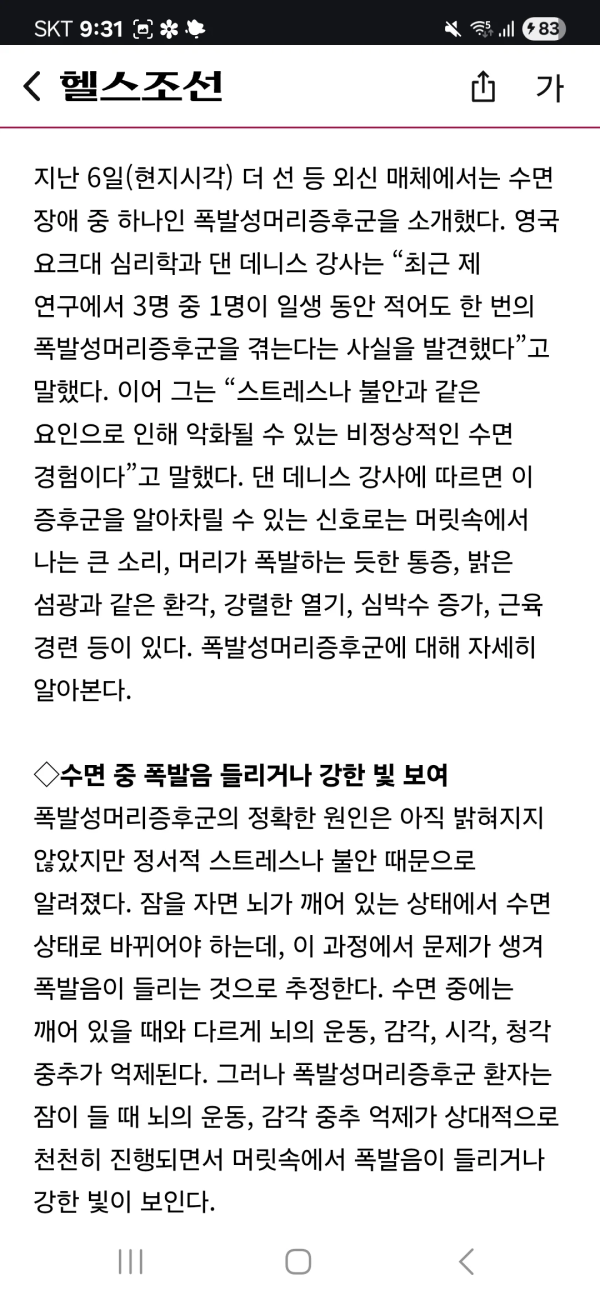 폭발머리 증후군 작성자 정보 띵동띵동 작성 작성일 2025.11.17 13:39 컨텐츠 정보 266 조회 1 댓글 목록 본문 요즘 자다가 폭발하는 소리 들리면서 깨길래 ㅅㅂ 뭐지? 뇌에 문제있나? 했는데 폭발머리 증후군이였음. 인구 10% 정도가 경험한다네 건강이 최고다 하.. 관련자료 댓글 1 방귀끼다똥지림님의 댓글 방귀끼다똥지림 작성일 13:40 레제증후군 ㄷㄷ 레제증후군 ㄷㄷ 로그인한 회원만 댓글 등록이 가능합니다. 목록