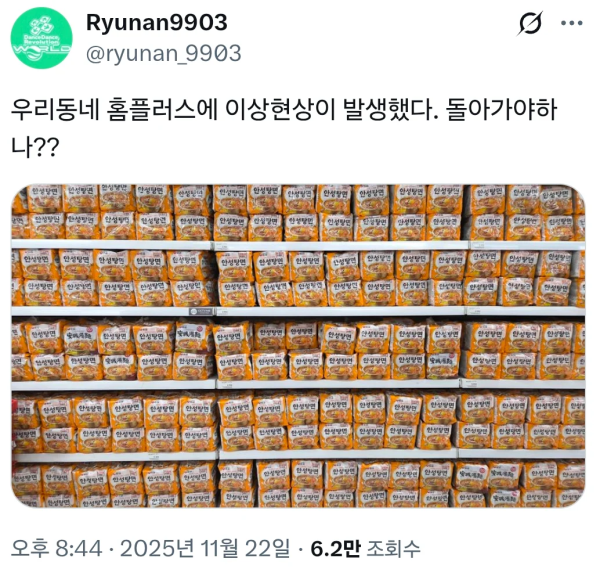 뭔가 이상한 일이 생긴 홈플러스 작성자 정보 꼴칼코마니 작성 작성일 2025.11.23 16:53 컨텐츠 정보 172 조회 1 댓글 목록 본문 홈플 폐점한다고 재고처리 하는 건가??? 관련자료 댓글 1 짱구님의 댓글 짱구 작성일 17:09 머지 발주실수인가ㅋㅋㅋ 머지 발주실수인가ㅋㅋㅋ 로그인한 회원만 댓글 등록이 가능합니다. 목록