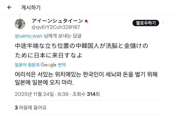트위터(X) 업데이트이후 현재 일본 근항 작성자 정보 오이날다 작성 작성일 2025.11.24 10:40 컨텐츠 정보 21 조회 목록 본문 헛저격 하는게 아니고 진짜다. 근데 저런 머저리들 말고 국적 세탁해서 한국인이 찌르는거 피해 달아난 일러레나 작가도 있을텐데 이건 좀 걱정이네... 관련자료 댓글 0 등록된 댓글이 없습니다. 로그인한 회원만 댓글 등록이 가능합니다. 목록