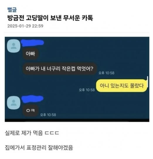 고딩딸이 보낸 무서운 문자 작성자 정보 노잼러 작성 작성일 2025.11.26 12:49 컨텐츠 정보 3 조회 1 댓글 목록 본문 고딩딸이 보낸 무서운 문자 관련자료 서명 i'm 노잼러 댓글 1 시바견님의 댓글 시바견 작성일 12:54 개무섭네 ㅋㅋㅋㅋㅋ 개무섭네 ㅋㅋㅋㅋㅋ 로그인한 회원만 댓글 등록이 가능합니다. 목록