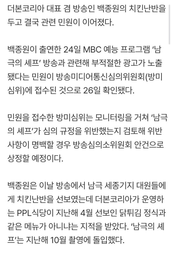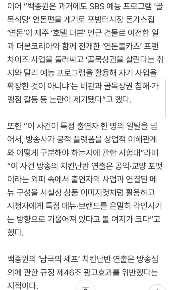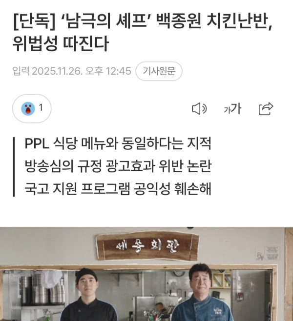 [단독] ‘남극의 셰프’ 백종원 치킨난반, 위법성 따진다 작성자 정보 졸려 작성 작성일 2025.11.26 13:59 컨텐츠 정보 12 조회 1 댓글 목록 본문 뭐만하면 민원 러쉬에 이런 기사도 같이 나는거 보면 그나마 축소 편성한 7화도 한 5화쯤으로 줄이는게 나은거 같네 관련자료 댓글 1 막지마라님의 댓글 막지마라 작성일 14:00 접시까지 쳐짊어지고가서 세팅해논 꼬라지봐라 ㅋㅋㅋ 접시까지 쳐짊어지고가서 세팅해논 꼬라지봐라 ㅋㅋㅋ 로그인한 회원만 댓글 등록이 가능합니다. 목록