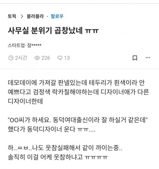 사무실 분위기가 곱창난 이유 작성자 정보 노잼러 작성 작성일 2025.11.27 12:25 컨텐츠 정보 7,521 조회 목록 본문 사무실 분위기가 곱창난 이유 관련자료 서명 i'm 노잼러 댓글 0 등록된 댓글이 없습니다. 로그인한 회원만 댓글 등록이 가능합니다. 목록