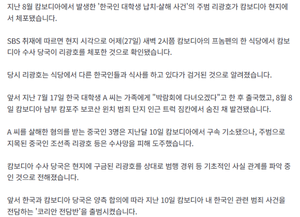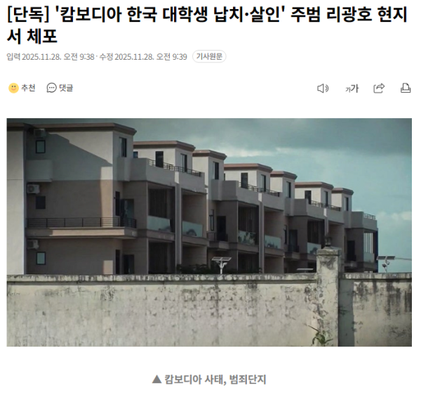 [단독] '캄보디아 한국 대학생 납치·살인' 주범 리광호 현지서 체포 작성자 정보 만만 작성 작성일 2025.11.28 11:39 컨텐츠 정보 55 조회 1 댓글 목록 본문 주범으로 지목된 중국인 조선족 리광호, 캄보디아 현지서 체포됨 관련자료 댓글 1 통기레쓰님의 댓글 통기레쓰 작성일 11:39 중국인이니 중국식 발음으로 이름을 불러줬으면 중국인이니 중국식 발음으로 이름을 불러줬으면 로그인한 회원만 댓글 등록이 가능합니다. 목록
