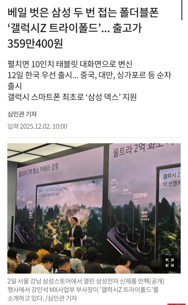 갤럭시Z 트라이폴드 출고가 359만 400원 작성자 정보 잡회원 작성 작성일 2025.12.02 11:22 컨텐츠 정보 72 조회 목록 본문 한번 접을때마다 +100만원인듯 관련자료 댓글 0 등록된 댓글이 없습니다. 로그인한 회원만 댓글 등록이 가능합니다. 목록