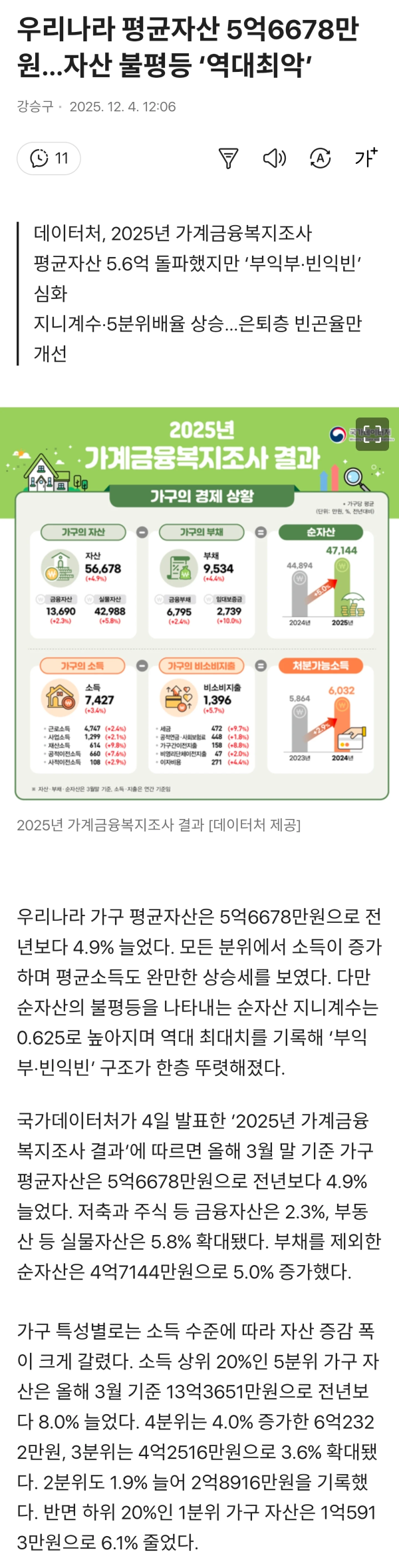 우리나라 평균자산 5억6678만원…자산 불평등 ‘역대최악’ 작성자 정보 졸업만번째 작성 작성일 2025.12.05 12:42 컨텐츠 정보 100 조회 목록 본문 우리나라 평균자산 5억6678만원…자산 불평등 ‘역대최악’ 관련자료 댓글 0 등록된 댓글이 없습니다. 로그인한 회원만 댓글 등록이 가능합니다. 목록