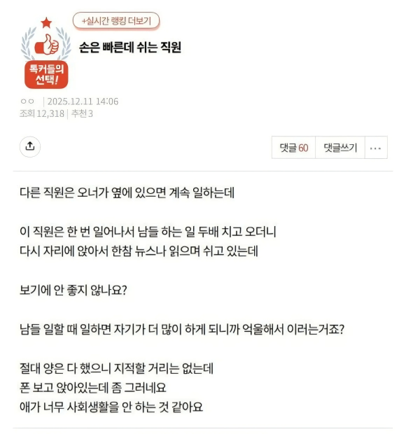 손은 빠른데 쉬는 직원 작성자 정보 땡큐 작성 작성일 2025.12.13 11:12 컨텐츠 정보 8,541 조회 목록 본문 손은 빠른데 쉬는 직원 관련자료 댓글 0 등록된 댓글이 없습니다. 로그인한 회원만 댓글 등록이 가능합니다. 목록