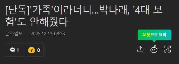 박나래 매니저 4대 보험 미가입 고발의 웃긴 점 작성자 정보 제발올킬 작성 작성일 2025.12.13 12:54 컨텐츠 정보 7,830 조회 1 댓글 목록 본문 박나래 매니저 4대 보험 미가입 고발의 웃긴 점 관련자료 댓글 1 반반무마니님의 댓글 반반무마니 작성일 12.13 19:55 매일 뭐 하나씩 터지네 ㄷㄷ 매일 뭐 하나씩 터지네 ㄷㄷ 로그인한 회원만 댓글 등록이 가능합니다. 목록