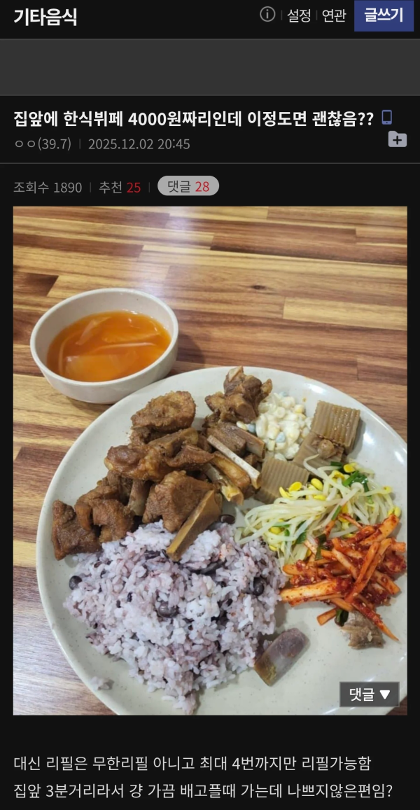 집앞에 한식뷔페 4,000원 평가좀 작성자 정보 벤츠타자 작성 작성일 2025.12.13 16:34 컨텐츠 정보 7,558 조회 1 댓글 목록 본문 집앞에 한식뷔페 4,000원 평가좀 관련자료 댓글 1 샤오미님의 댓글 샤오미 작성일 12.13 19:55 좆소 급식이 저정도 나옴 좆소 급식이 저정도 나옴 로그인한 회원만 댓글 등록이 가능합니다. 목록