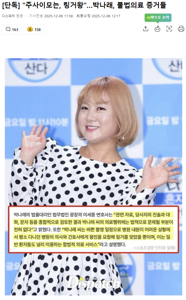 횡령 혐의가 더 이상 문제가 아니게 된 박나래.jpg 작성자 정보 널따먹는다 작성 작성일 2025.12.06 13:31 컨텐츠 정보 91 조회 1 댓글 목록 본문 횡령 혐의가 더 이상 문제가 아니게 된 박나래.jpg 관련자료 댓글 1 초록물고기님의 댓글 초록물고기 작성일 13:51 이제 자기 공황발작있어서 그렇다고 호소하는거 아니냐? 이제 자기 공황발작있어서 그렇다고 호소하는거 아니냐? 로그인한 회원만 댓글 등록이 가능합니다. 목록