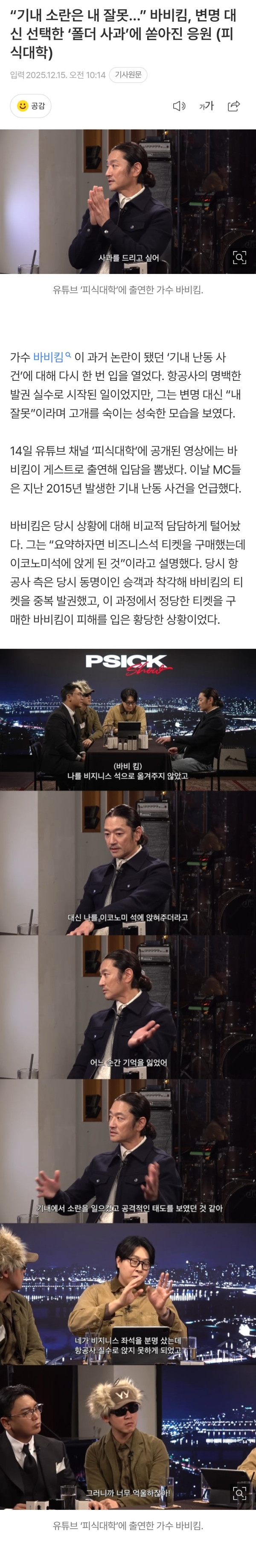 바비킴, 피식대학 기내 소란사건 전말 언급