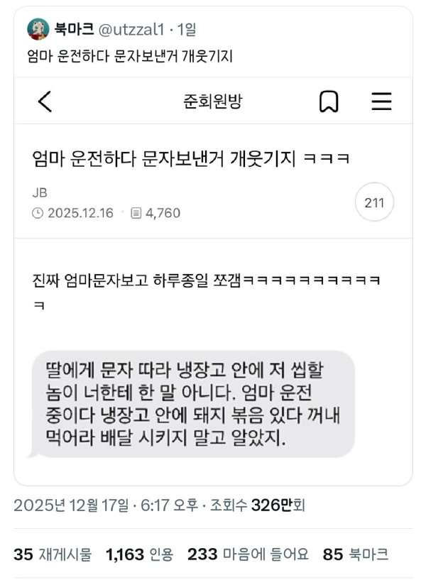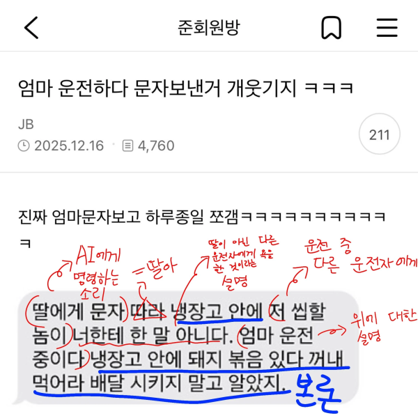 엄마가 운전하다 보낸 문자 작성자 정보 푸바오 작성 작성일 2025.12.19 11:09 컨텐츠 정보 209 조회 목록 본문 엄마가 운전하다 보낸 문자 관련자료 댓글 0 등록된 댓글이 없습니다. 로그인한 회원만 댓글 등록이 가능합니다. 목록