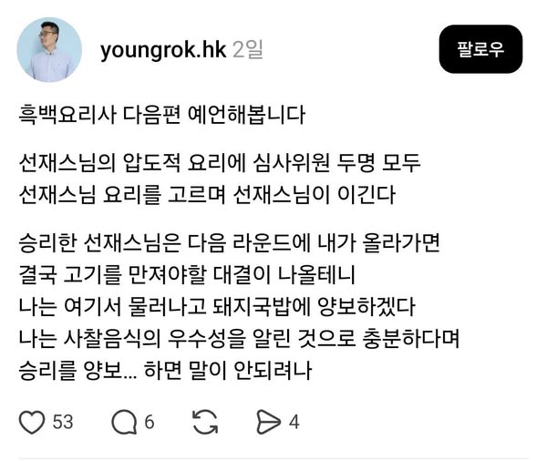 흑백요리사 4화 예측 작성자 정보 GG요 작성 작성일 2025.12.20 12:13 컨텐츠 정보 150 조회 목록 본문 흑백요리사 4화 예측 관련자료 댓글 0 등록된 댓글이 없습니다. 로그인한 회원만 댓글 등록이 가능합니다. 목록