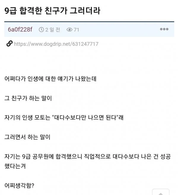9급 합격한 친구가 그러더라 작성자 정보 뇌출혈 작성 작성일 2025.12.22 18:27 컨텐츠 정보 162 조회 1 댓글 목록 본문 9급 합격한 친구가 그러더라 관련자료 댓글 1 졸업만번째님의 댓글 졸업만번째 작성일 20:07 맞는말이지 맞는말이지 로그인한 회원만 댓글 등록이 가능합니다. 목록
