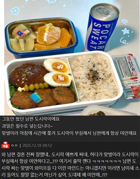 남편 도시락 싸준 거 자랑글에 달린 베플 1위 작성자 정보 GG요 작성 작성일 2025.12.23 12:48 컨텐츠 정보 213 조회 목록 본문 남편 도시락 싸준 거 자랑글에 달린 베플 1위 관련자료 댓글 0 등록된 댓글이 없습니다. 로그인한 회원만 댓글 등록이 가능합니다. 목록