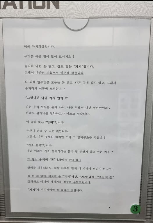 어느 lh 아파트 자치회장의 일침 작성자 정보 GG요 작성 작성일 2025.12.24 14:47 컨텐츠 정보 9,075 조회 목록 본문 어느 lh 아파트 자치회장의 일침 관련자료 댓글 0 등록된 댓글이 없습니다. 로그인한 회원만 댓글 등록이 가능합니다. 목록