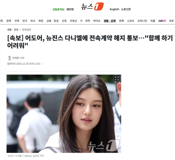 [속보] 어도어, 뉴진스 다니엘에 전속계약 해지 통보…"함께 하기 어려워" 작성자 정보 민수인데요 작성 작성일 2025.12.29 11:23 컨텐츠 정보 414 조회 목록 본문 [속보] 어도어, 뉴진스 다니엘에 전속계약 해지 통보…"함께 하기 어려워" 관련자료 댓글 0 등록된 댓글이 없습니다. 로그인한 회원만 댓글 등록이 가능합니다. 목록