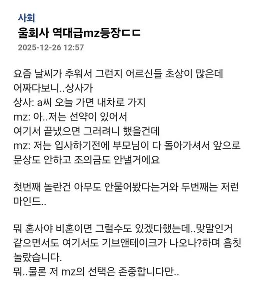 신입사원이 장례식장에 가지 않겠다는 이유 작성자 정보 GG요 작성 작성일 2025.12.29 13:01 컨텐츠 정보 172 조회 목록 본문 신입사원이 장례식장에 가지 않겠다는 이유 관련자료 댓글 0 등록된 댓글이 없습니다. 로그인한 회원만 댓글 등록이 가능합니다. 목록