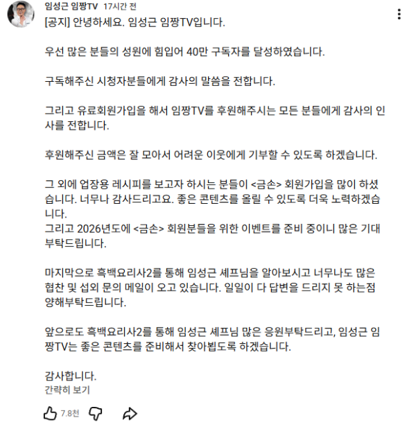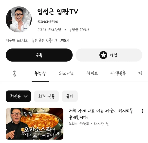 흑백)지금 미친듯이 떡상하고 있는 임성근 유튜브 작성자 정보 왕쟈지 작성 작성일 2025.12.30 13:45 컨텐츠 정보 312 조회 목록 본문 흑백 출연후 구독자 43만 달성 12시간만에 1분짜리 영상 조회수 43만 달성 유튜브 멤버십 가입자 대폭주 유튜브 멤버십 가입한 비용 전부 기부 관련자료 댓글 0 등록된 댓글이 없습니다. 로그인한 회원만 댓글 등록이 가능합니다. 목록