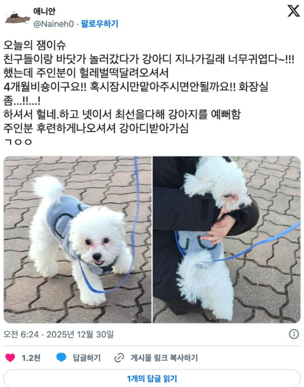 강아지 예쁘다고 했는데 저한테 왜 이러세요 작성자 정보 앰흑 작성 작성일 2026.01.02 13:39 컨텐츠 정보 99 조회 목록 본문 강아지 예쁘다고 했는데 저한테 왜 이러세요 관련자료 댓글 0 등록된 댓글이 없습니다. 로그인한 회원만 댓글 등록이 가능합니다. 목록