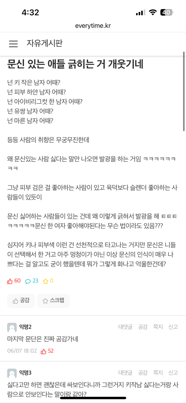 문신있는 애들 긁히는거 개웃기네 작성자 정보 터줏대감 작성 작성일 2026.01.07 10:59 컨텐츠 정보 2,065 조회 목록 본문 생각해보니 우리나라는 "우리나라사람끼리 인종차별"이란 개념이 없어서 키가 작네 얼굴이 어쩌네 피부가 나쁘네 이렇게 남의 외모 평가하는거 숨쉬듯이 하잖음? 관련자료 댓글 0 등록된 댓글이 없습니다. 로그인한 회원만 댓글 등록이 가능합니다. 목록