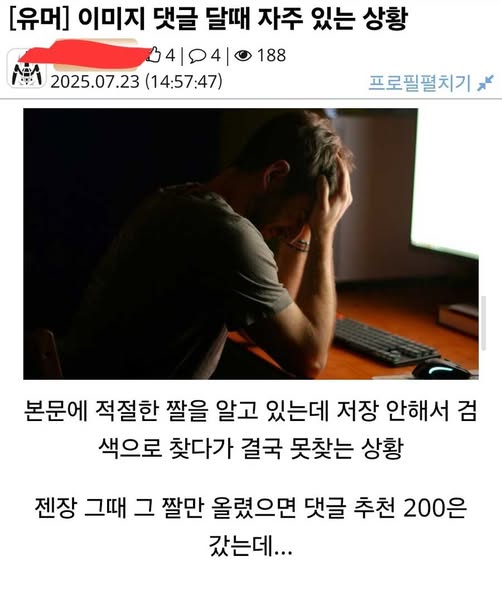 이미지 댓글 달려고 할 때 자주있는 상황 작성자 정보 GG요 작성 작성일 2026.01.11 11:57 컨텐츠 정보 973 조회 목록 본문 이미지 댓글 달려고 할 때 자주있는 상황 관련자료 댓글 0 등록된 댓글이 없습니다. 로그인한 회원만 댓글 등록이 가능합니다. 목록