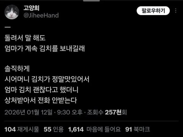 의외로 엄마 억장 무너지게하는 말 작성자 정보 GG요 작성 작성일 2026.01.15 12:09 컨텐츠 정보 214 조회 목록 본문 의외로 엄마 억장 무너지게하는 말 관련자료 댓글 0 등록된 댓글이 없습니다. 로그인한 회원만 댓글 등록이 가능합니다. 목록
